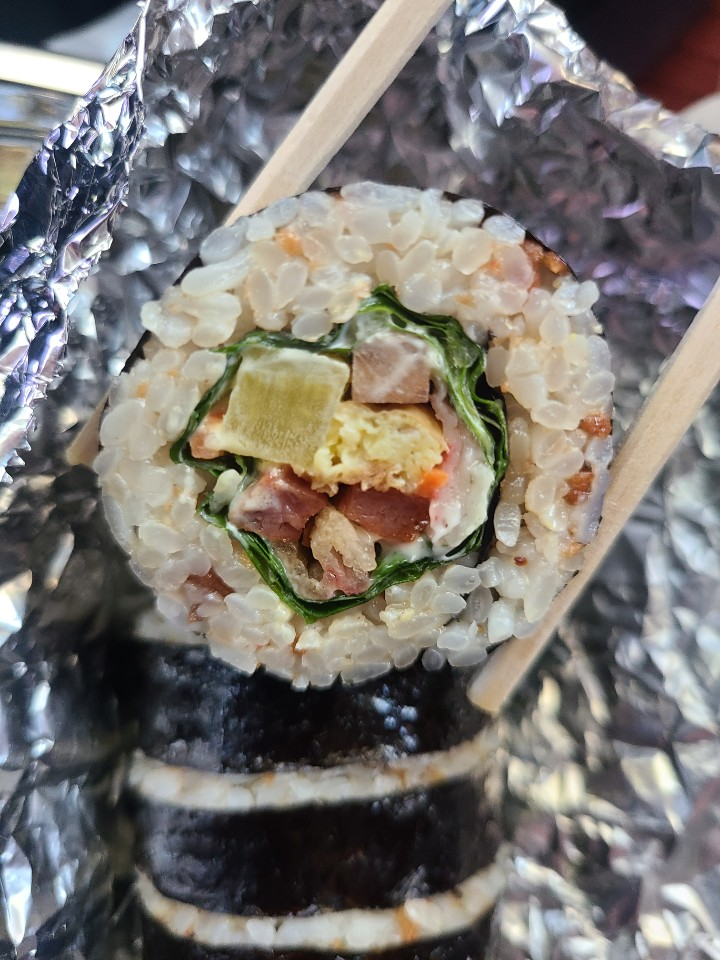 오는정김밥은 생긴것만 봐서는 특별해 보이지 않습니다. 평범한 재료가 들어가 김밥인데요. 대신 튀긴 유부가 들어가 있습니다. 밥알 사이사이에도 튀긴 유부가 들어가 있는데요. 이것이 고소함과 바삭바삭한 식감을 줘서 먹는 재미를 극대화시킵니다. 오는정김밥은 오래 두면 호일에 기름이 쌓일만큼 기름기가 많은 김밥입니다. 겉면에 참기름도 많이 발라져있고, 튀긴유부에서도 기름이 나오는 것 같습니다. 아무튼 저는 정말 맛있게 먹었습니다. 같이 먹었던 분은 밥이 조금 떡져있다는 평가를 했습니다.