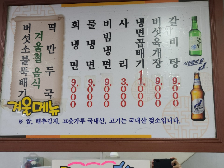 냉면은 1인분에 9,000원입니다. 냉면 곱배기는 11,000원이고, 떡만두국이나 버섯육개장, 갈비탕을 판매합니다.