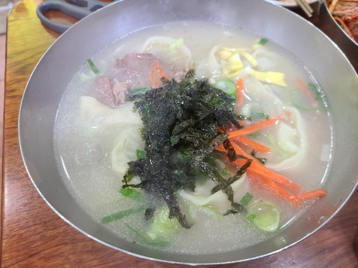 사골 베이스의 만두국입니다. 만두국에 비빔냉면에 올라가는 쇠고기 고명이 똑같이 들어있었습니다. 만두 자체는 시판 제품을 사용하시는 것 같았습니다. 사골 국물이란 것을 제외하고는, 그냥 평범한 만두국이었습니다.