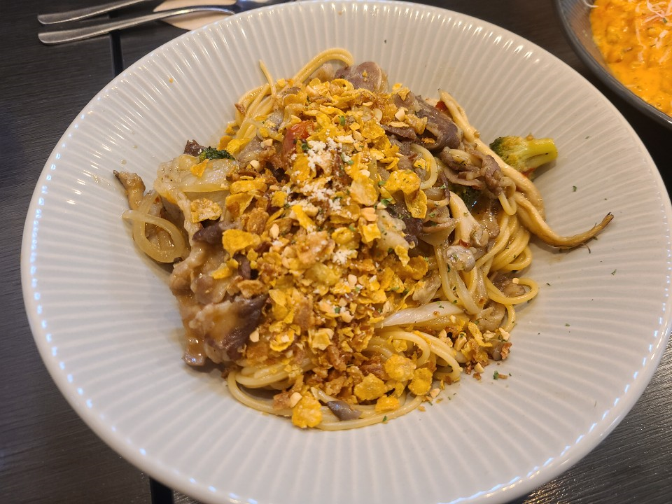 우삼겹오일이 처음 나왔을 때 양이 엄청 많아서 놀랐습니다. 간도 잘 맞고, 브로콜리와 양파, 우삼겹등 재료가 듬뿍들어간 파스타였습니다. 가격대비 만족스러운 맛이었습니다. 약간 매콤한 맛도 나서, 한국인들이 정말 좋아할 맛이었습니다.