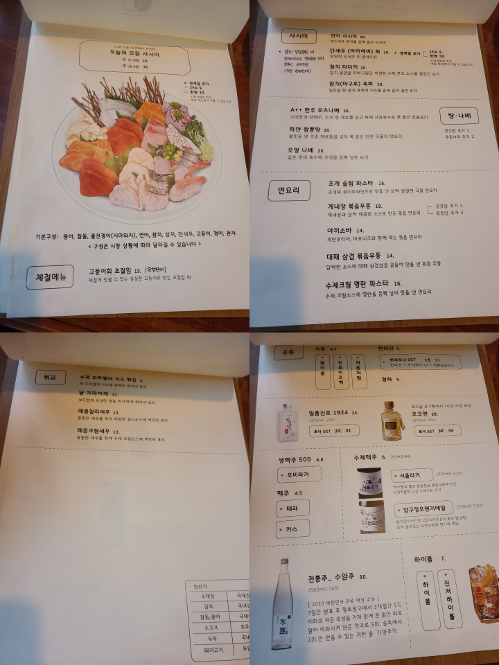 오늘의 모듬 사시미가 메인입니다. 그 외에 사시미, 탕·나베, 면요리, 튀김 등을 판매합니다. 메뉴판만 봐도 먹고싶은게 정말 많아서, 다 시키고 싶었습니다.