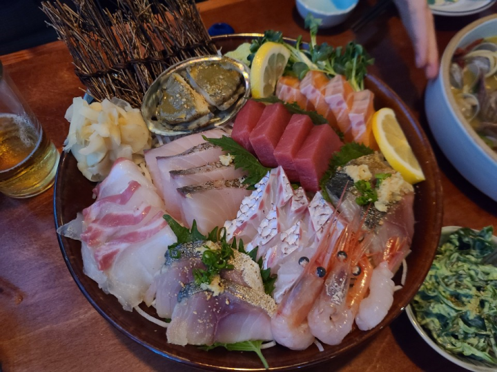 오늘의 모듬 사시미 中을 시켰습니다. 2~3인용으로 3.8만원의 메뉴인데요. 고등어회, 연어회, 농어회, 단새우, 참치회 등으로 구성되어 있었습니다. 가격대비 구성이 아주 좋은지는 모르겠으나, 비쥬얼은 정말 예술이었습니다. 너무 예쁘게 담아주셔서 사진찍기 좋았습니다. 술안주로는 아주 적절했습니다.