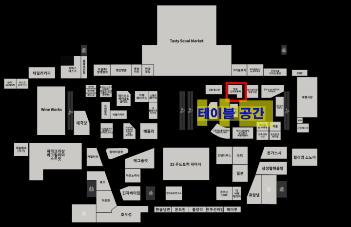 탐광은 더현대서울 지하 1층 식품관에 있습니다. 사이즈만 보셔도, 다이닝 공간이 따로 없는 매장이란 것을 알 수 있는데요. 매장 주변으로 2명씩 먹을 수 있는 바 테이블들이 있고, 그 주변에는 음식점들이 공용으로 사용하는 테이블이 있습니다.