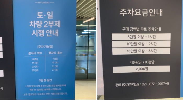 3월에는 토요일 일요일 차량 2부제를 시행했습니다. 주차요금도 10분당 2,000원으로 어마무시하게 비싼데요. 현대백화점 앱을 다운받으면 2시간 무료 주차권을 준다고 합니다.