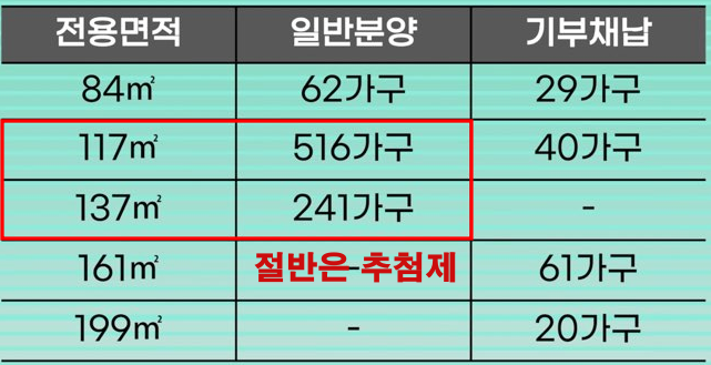 여기서 주목해야 할 것은 바로 추첨제인데요. 전용 84제곱미터 초과 일반분양의 절반은 추첨제입니다. 117 제곱의 절반인 258가구와 137 제곱의 절반인 125가구는 추첨제입니다. 총 383가구가 추첨제이기 때문에, 기존에 청약시장에서 번번이 실패하셨던, 저가점자와 1 주택자에게도 기회가 돌아온다는 것입니다. 서울에서 이 정도로 추첨제가 나오는 것은 흔한 편이 아닙니다.