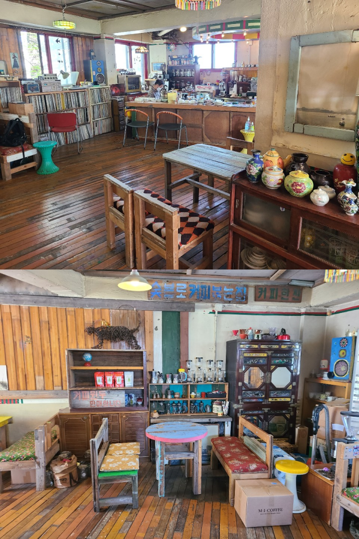 카페 분위기는 정말 레트로합니다. 바닥은 마루로 되어 있어서, 약간 옛날 교실같은 느낌도 있습니다. 나무로 된 의자와 탁상의 페인트가 벗겨진 느낌도 좋았습니다.