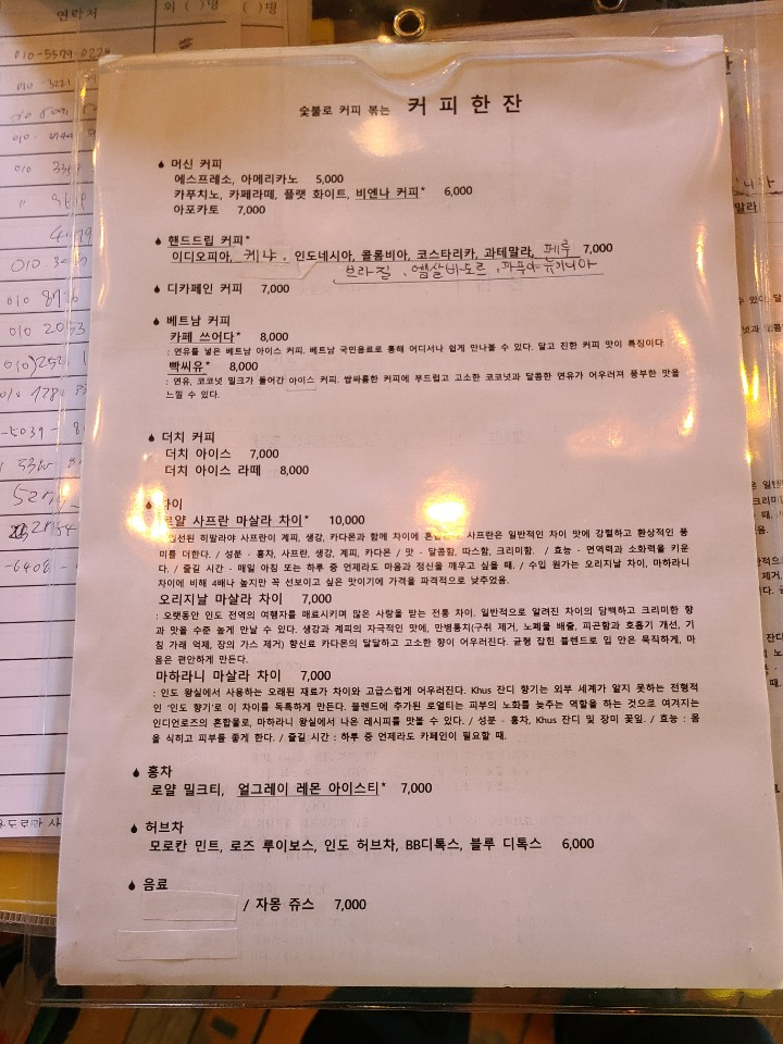 머신커피와 핸드드립, 베트남커피, 차이 등을 판매합니다. 숯불로 커피를 로스팅한다고 합니다.