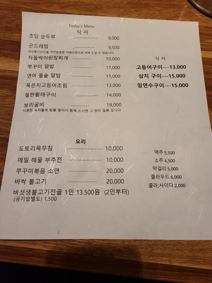 곤드레밥과 같은 식사메뉴와 바싹 불고기 같은 요리를 판매하고 있습니다. 생선구이도 종류가 3개나 있습니다.