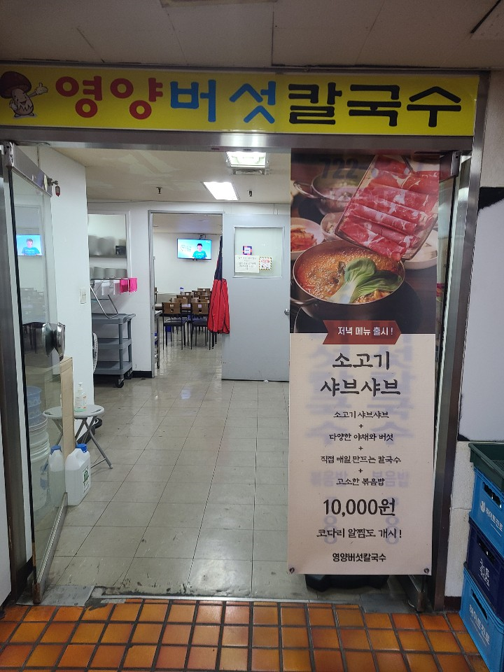 메뉴판은 영양버섯칼국수와 김치버섯칼국수, 버섯소고기샤브 등이 있습니다. 낚지볶음과 오뎅전골도 저녁 메뉴로 판매합니다.