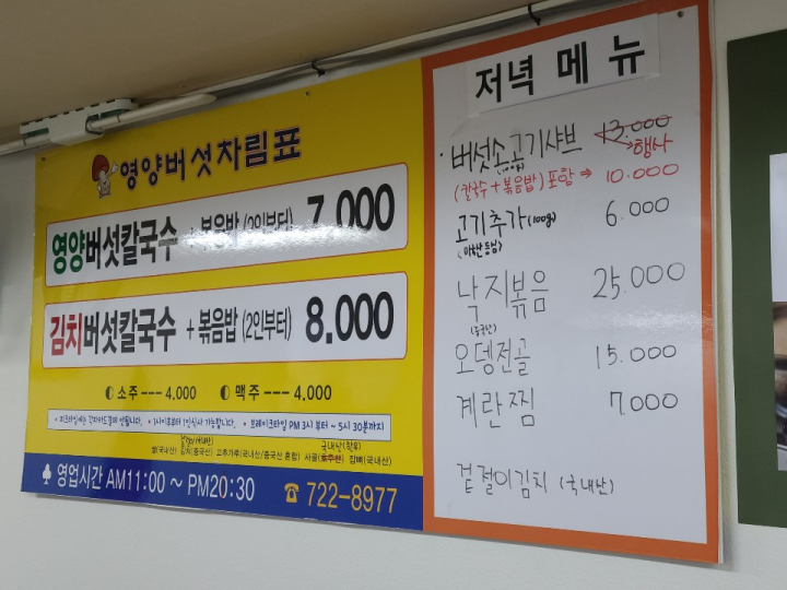 메뉴판은 영양버섯칼국수와 김치버섯칼국수, 버섯소고기샤브 등이 있습니다. 낚지볶음과 오뎅전골도 저녁 메뉴로 판매합니다.