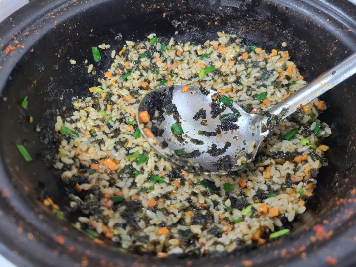 볶음밥은 계란이 들어가지 않아서, 등촌샤브칼국수 스타일과는 달랐습니다. 김이 엄청 많이 들어간 볶음밥이었는데요. 김이 비리지 않고, 감칠맛을 돋구아 줘서 정말 맛있었습니다.
