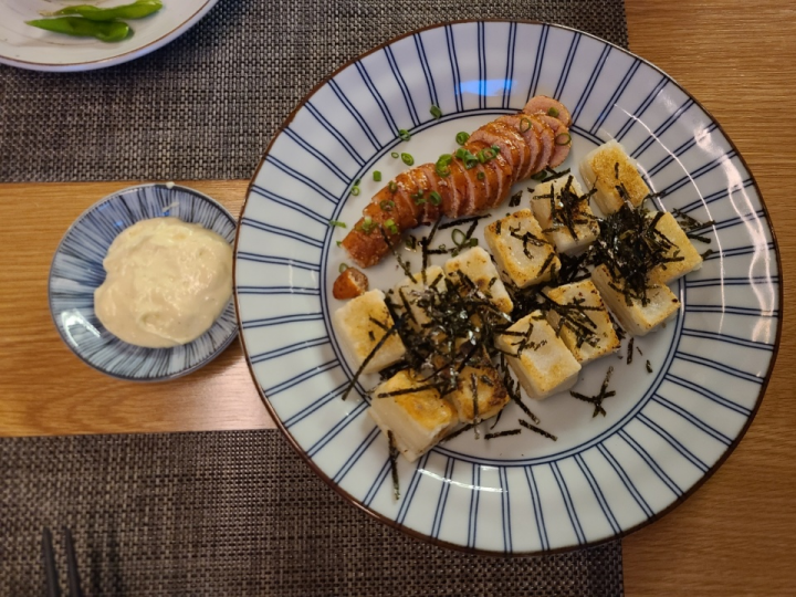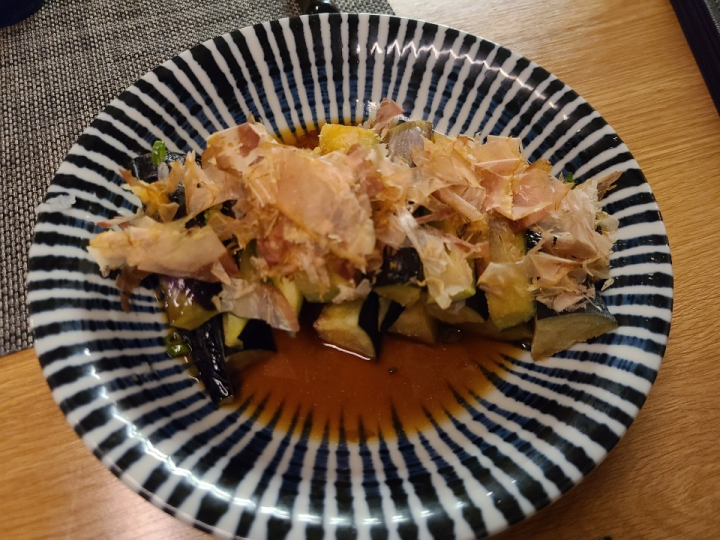 튀긴 가지에 가쓰오부시, 간장소스가 곁들여진 간단 메뉴입니다. 간단메뉴에 포함되어 있어서 양이 적을줄 알았는데 생각보다 양이 많았습니다. 가지 특유의 식감에 가쓰오부시를 같이 먹으니까 아주 잘어울렸습니다. 간장 소스를 너무 많이 적셔 먹으면 조금 짰습니다. 그냥 가지에, 가쓰오부시만 살짝 간장에 적셔 먹으시기를 추천합니다.