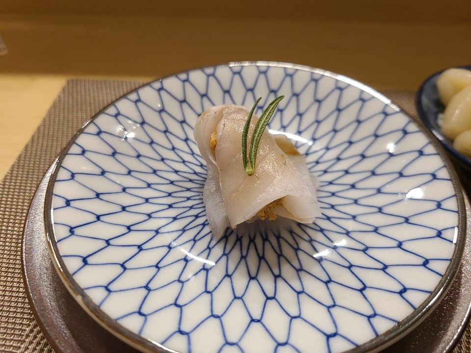 한치에 유자가루가 뿌려진 스시입니다.