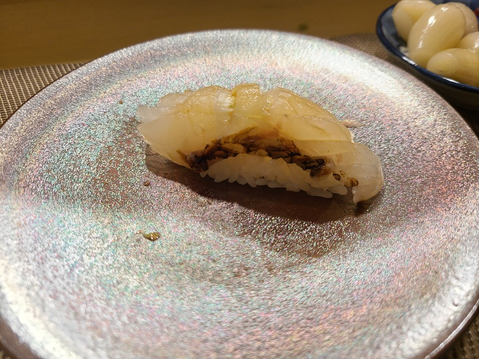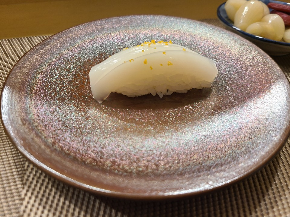 한치에 유자가루가 뿌려진 스시입니다.