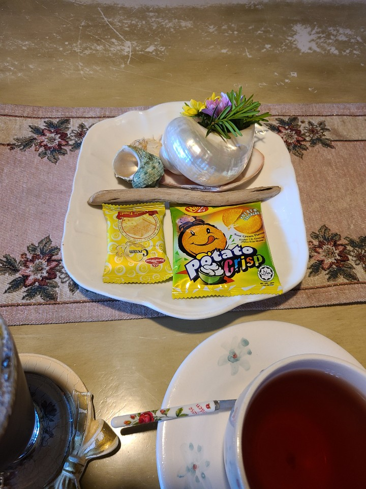 음료를 시키면 특이한 소라껍질 장식과 함께 과자를 주십니다.