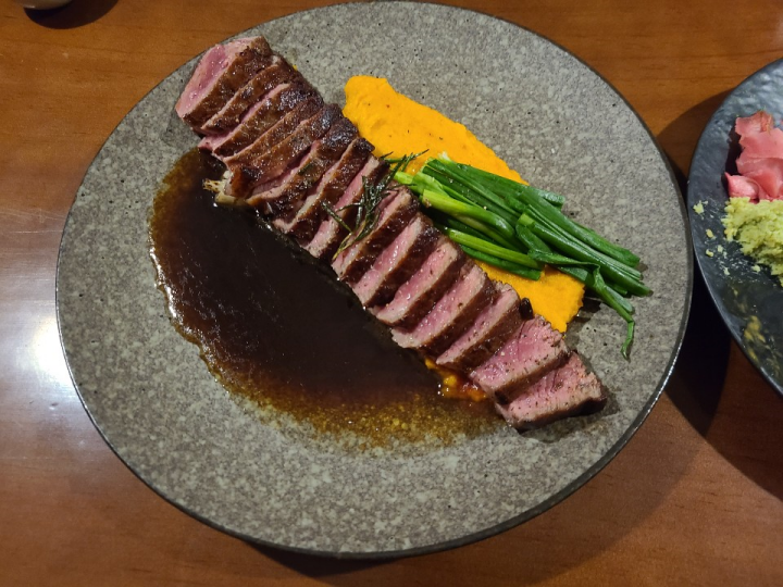 채끝 스테이크도 정말 맛있었습니다. 소스도 맛있었고, 함께 나온 단호박 무스는 달달하고 부드러우면서, 약간 매콤한 맛이 나는게 신기했습니다. 후추가 많이 들어간건지, 산초가루가 들어갔는지 혀가 살짝 얼얼한 맛이 났습니다. 쪽파도 함께 주신 것도 매력있었습니다.