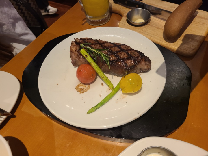 달링 스트렙 스테이크를 미디엄 레어로 시켰습니다. 그릇이 정말 뜨겁습니다.