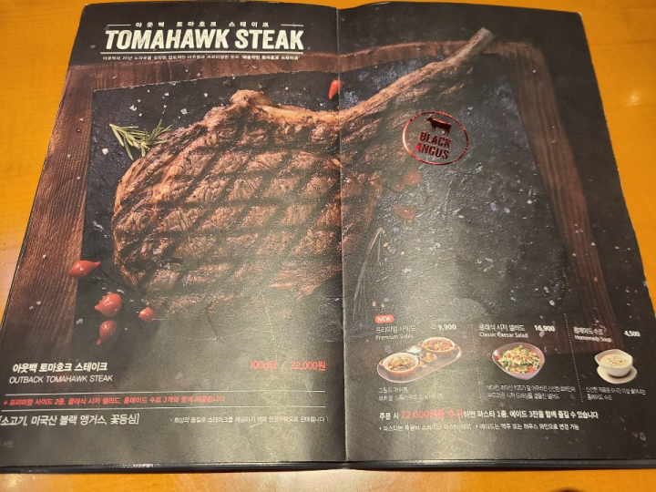최근 아웃백에서 밀고 있는 토마호크 스테이크입니다. 100g 단위로 주문할 수 있는데요. 프리미엄 사이드와 클래식 시저 샐러드, 홈메이드 수프를 제공합니다.