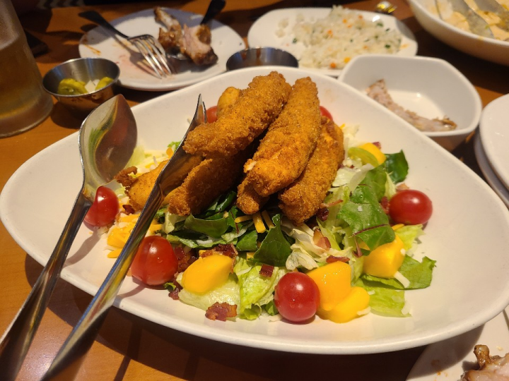 치킨 텐더 샐러드는 아웃백 어플을 다운받아서, 무료 쿠폰으로 먹었습니다. 텐더는 6개가 올라가 있었습니다. 사실 너무 배불러서, 이건 제대로 먹지 못했습니다.