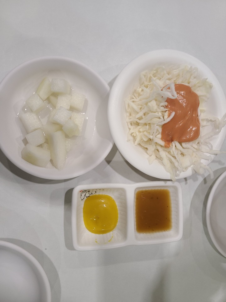 포장하는 것은 줄이 조금 있습니다. 원조신포닭강정과 신포찬누리닭강정 모두 포장 줄은 길지만, 매장에서 먹는 것은 웨이팅이 없습니다. 밑반찬으로는 무와 양상추 샐러드, 소스가 나옵니다.