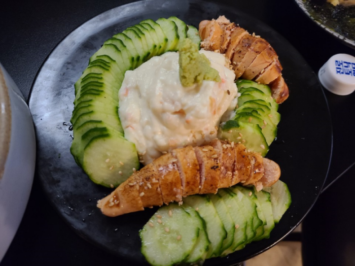 이것도 맥주안주로 최고인 음식이었습니다. 마요네즈 베이싀 감자 사라다에 오이, 짭짤한 명란구이를 같이 먹으면 조화가 미쳤습니다. 명란만 먹으면 쫌 짜서, 오이와 감자사라다가 필수입니다.