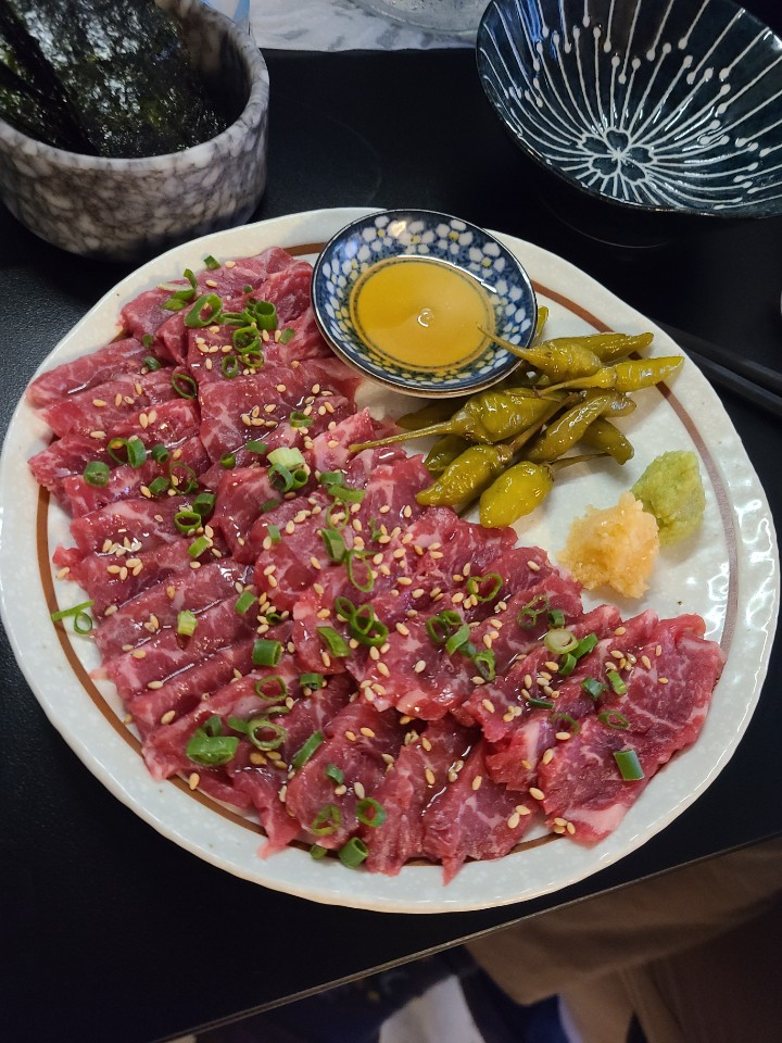 육사시미는 아주 고소하고 맛있었습니다. 김에 같이 주신 간마늘과 와사비 올려서 싸먹으면 조화가 좋았습니다. 화요와 아주 잘 어울리는 안주였습니다.
