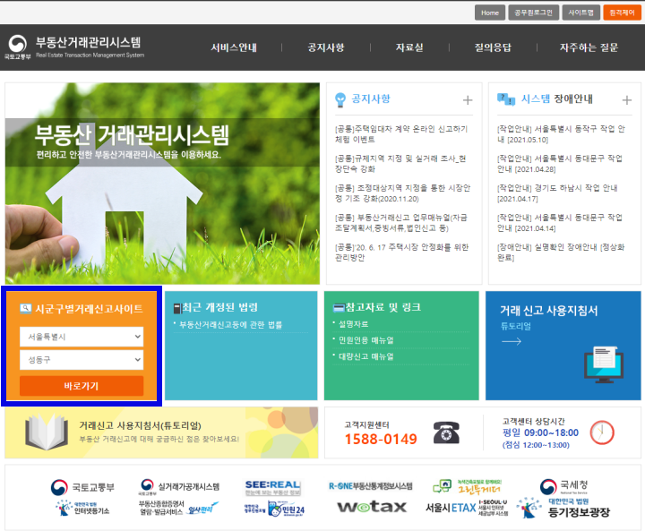 해당 사이트에서 시군구별 거래신고 사이트를 찾아 들어가, 신고하시면 됩니다.