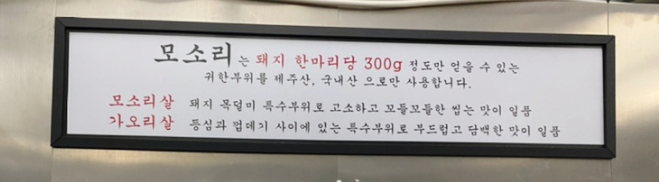 오늘은 금남시장에 돼지고기 특수부위 맛집인 금호동 모소리를 소개하겠습니다. 모소리는 신사, 길음, 사당, 금호, 동묘, 명동 등 여러 지점을 가진 돼지고기 특수부위 전문점입니다. 돼지고기 한마리당 300g 정도만 나오는 특수부위를 파는 식당인데요. 과연 그 고기맛은 어땠을지 지금부터 알아보겠습니다.