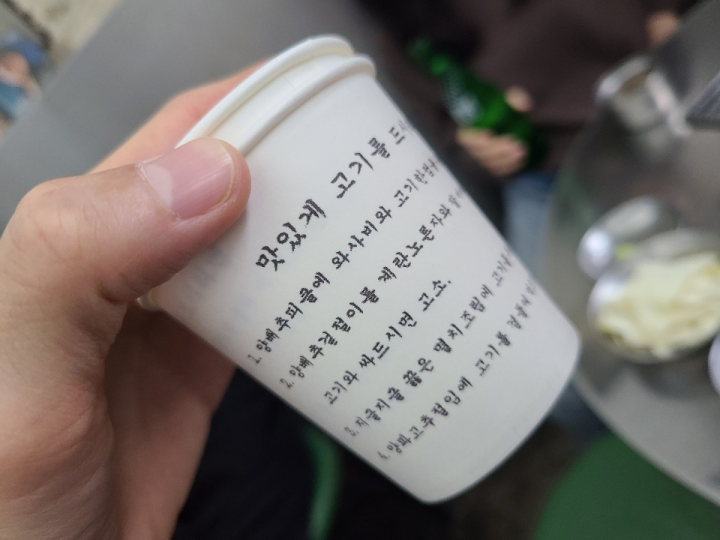 모소리 고기를 맛있게 먹는 법이 종이컵에 적혀있습니다. 양배추피클과 와사비를 같이 먹으라고 하네요. 양배추 겉절이나, 멸치조림도 이용하라는 뻔한 내용이 적혀있습니다.