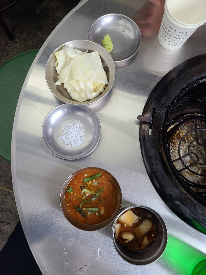 밑반찬으로 맬젖과 소금, 양파간장절임, 양배추 절임이 나옵니다.