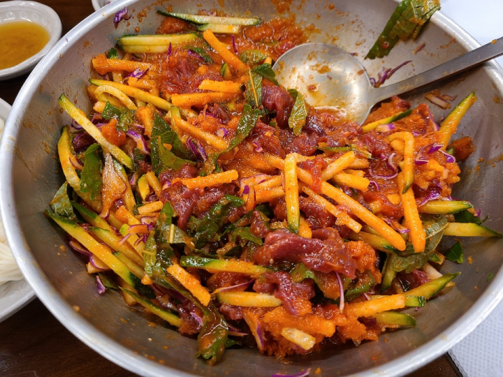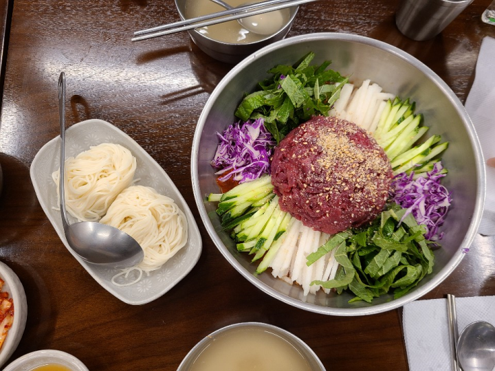 육회물회는 양이 조금 많습니다. 2명이 방문하면, 육회물회 하나만 시켜도 괜찮을 것 같습니다. 육회물회를 시키면 소면도 같이 나옵니다.