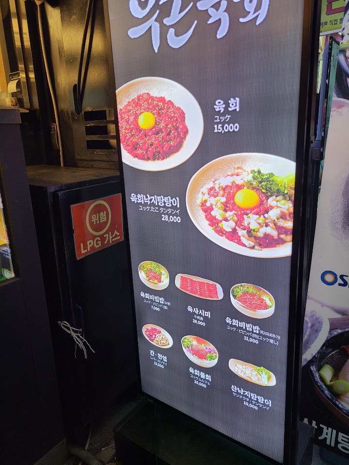 육회와 육회낙지탕탕이, 육회비빔밥 등을 판매합니다. 육회는 한접시에 15,000원입니다.