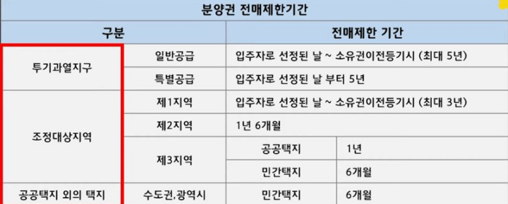 위의 표와 같이 투기과열지구는 최대 5년까지 전매제한 기간이 있습니다. 보통 아파트의 경우 청약 후 3년 이내에 준공이 되는데요. 5년이 적용되면, 입주하고 최소 2년을 더 살아야 아파트를 매도할 수 있다는 것입니다. 조정대상지역의 경우 1 지역, 2 지역, 3 지역 여부에 따라 전매제한 기간이 달라집니다. 수도권/광역시의 민간택지는 6개월 전매기간이 적용됩니다.