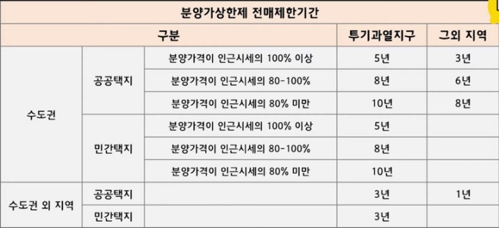 분양권 전매제한은 투기과열지구와 조정대상지역의 신규 분양 주택, 분양가 상한제 적용주택, 공공택지 외 택지의 분양 주택에 적용됩니다. 분양권 전매제한기간은 아래 표와 같이 적용됩니다.