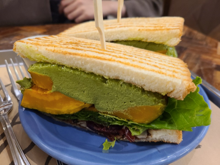 말차 두부 치즈 샌드위치는 비쥬얼이 정말 특이합니다. 말차 크림 샌드위치의 비쥬얼인데요. 이게 크림이 아니라 두부로 만든 것이라고 합니다. 일반적인 짭짤한 샌드위치가 아닌, 말차가 들어간 달달한 샌드위치입니다. 말차가 들어간 두부 치즈 크림이 나름 고소하면서 맛있습니다. 단호박이 들어가서 아주 샌드위치만 먹어도 든든해서 좋습니다. 단호박이 조금 뻑뻑하고 간은 조금 심심한 편입니다. 호불호가 갈릴 수 있는 맛입니다.