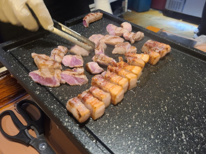 삼겹살과 목살, 생갈비살이 1인분씩 나오는 모듬한판입니다. 조금 초벌되어 나옵니다.