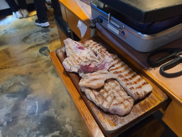 삼겹살과 목살, 생갈비살이 1인분씩 나오는 모듬한판입니다. 조금 초벌되어 나옵니다.