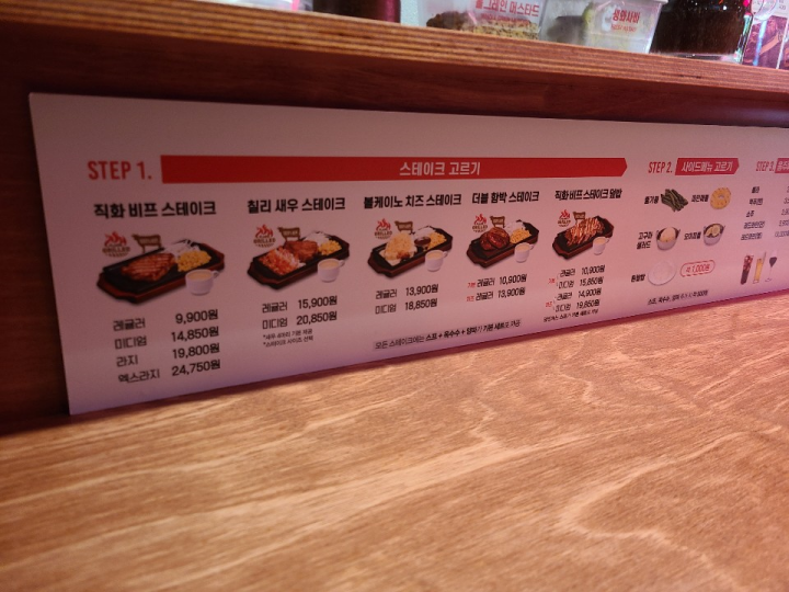 메뉴는 직화 비프스테이크와 칠리 새우스테이크, 볼케이노 치즈 스테이크, 더블 함박 스테이크, 스테이크 덮밥이 있습니다. 스테이크를 고르시면, 사이드 메뉴를 고르면 됩니다. 쌀밥의 경우 1천 원이 추가됩니다.