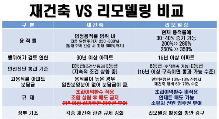 - 재건축은 조합 설립 후 사업시행 인가, 관리처분 인가 후 이주가 가능하나, 리모델링은 행위 허가 1회만 받으면 됨(주민 동의만 있다면 4~6년 안에 가능)