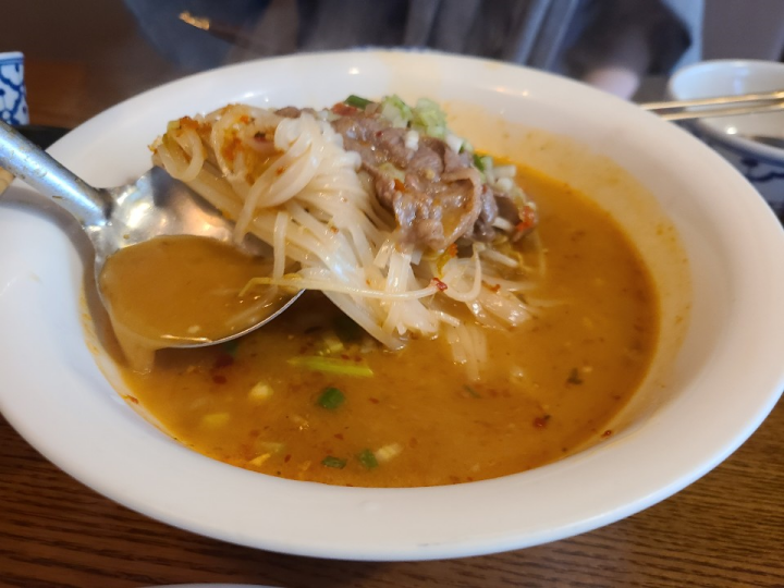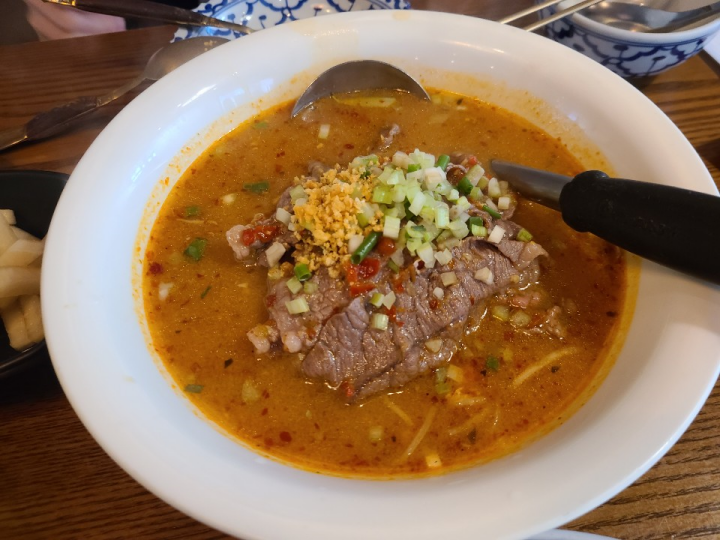 소고기가 들어간 똠양쌀국수입니다. 똠양꿍을 좋아하시면, 이 쌀국수도 정말 좋아하실 것 같습니다. 새콤하고, 달콤하고, 매콤한 맛의 조화가 정말 예술이었습니다. 국물이 너무 맛있어서 계속 떠먹고 싶은 맛이었습니다. 토핑으로 올라간 소고기도 진짜 부드러웠는데요. 이 메뉴는 정말 강력 추천합니다.