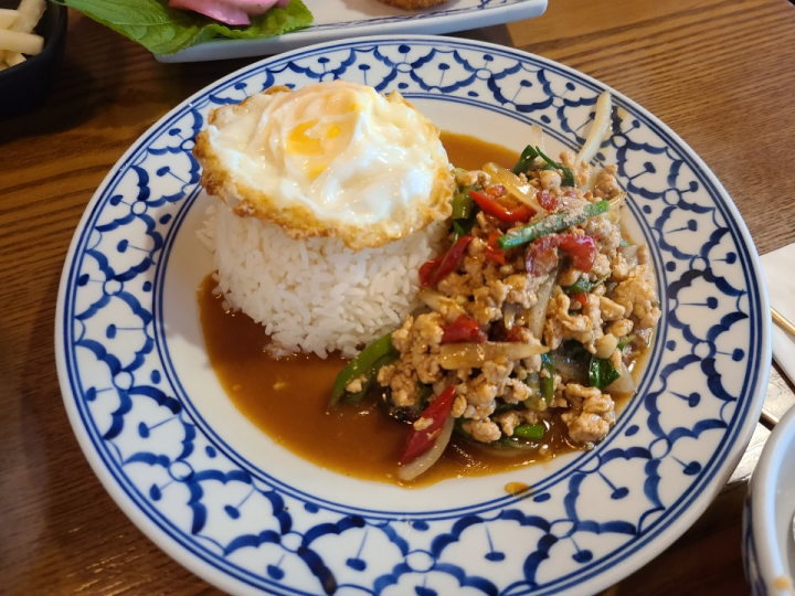 팟카파오 무쌉은 태국식 다진 돼지고기 덮밥입니다. 바질이 들어간 매콤한 돼지고기 덮밥인데, 다른 태국음식점의 무쌉보다는 향신료 향이 강했습니다. 다른 음식점에 비해 단맛도 적어서, 진짜 태국 현지의 맛에 가까웠는데요. 개인적으로 조금 더 달고, 향이 덜해서 제육볶음 맛이 나는 음식점의 무쌉이 더 맛있었습니다. 그래도 이집만의 깔끔한 맛이 괜찮았습니다.