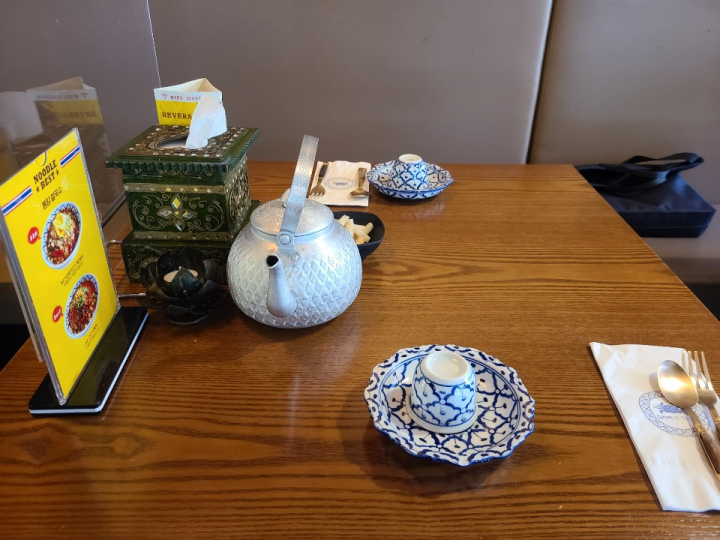 심플리타이는 태국 호텔 느낌의 식당입니다. 식기도 고급스럽고, 물도 자스민 차로 주십니다.