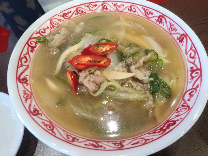 온면은 정말 진한 소고기무국 국물에 옥수수면이 들어간 음식 같은 느낌입니다. 이 국물이 정말 진국인데요. 파와 마늘, 차돌이 들어가 있습니다. 국물이 너무 맛있어서, 온면과 비빔면을 같이 시켜서 비빔면 한번 먹고, 온면의 국물 한번 먹으면 딱 좋습니다.