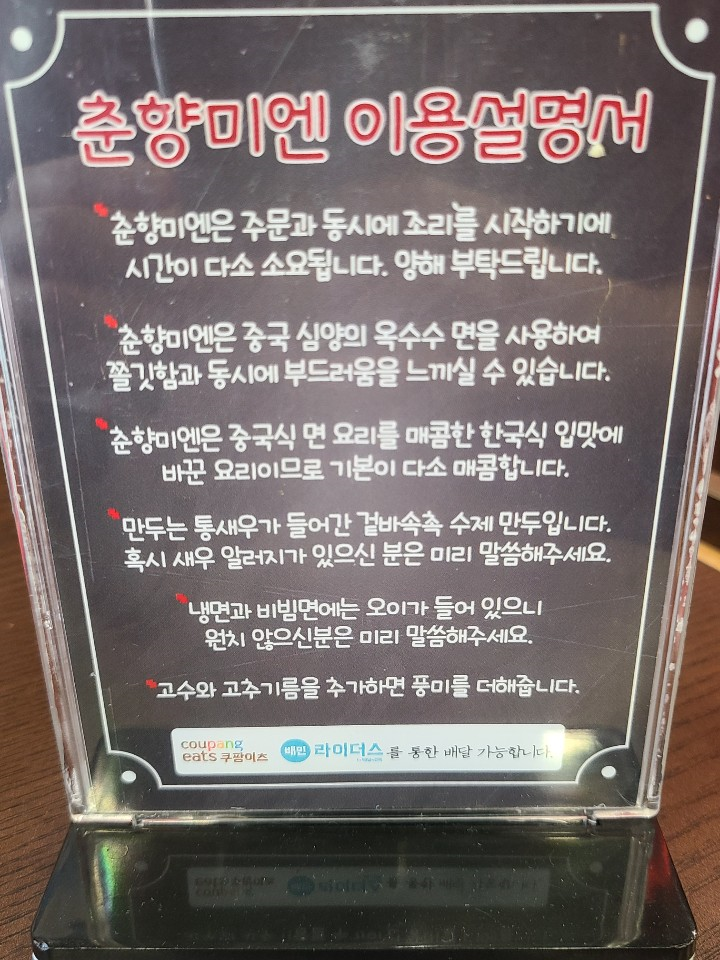 처음 먹어보는 음식이었는데, 한국인의 입맛에 잘 맞춰 개발하신 것 같습니다. 괜히 왕십리에서 이름을 날린게 아닌 것 같습니다. 중국식 면요리와 만두가 땡기신다면, 춘향미엔을 강력 추천합니다.
