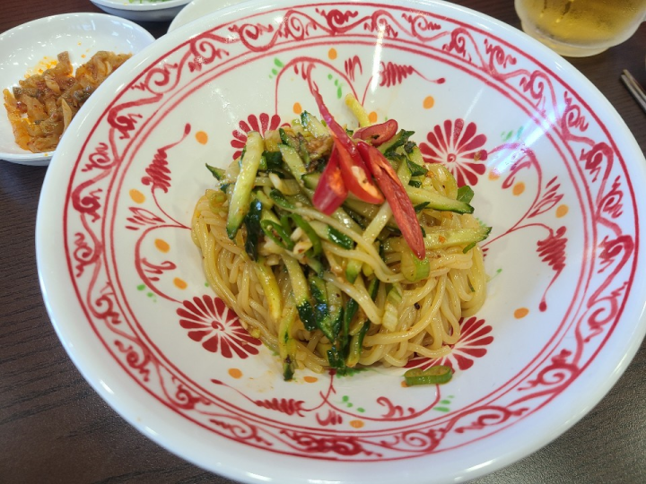 옥수수면에 매콤한 양념, 오이, 고추가 올라간 비빔면입니다. 뭐라고 표현하기 애매한 처음 먹어보는 비빔면이었는데요. 약간 간장 베이스에 매콤한 비빔면인데, 상큼한 맛도 있고 한국인이 딱 좋아할 음식이었습니다. 차돌한접시를 같이 시켜서, 이 비빔면에 싸먹으면 정말 맛있습니다.