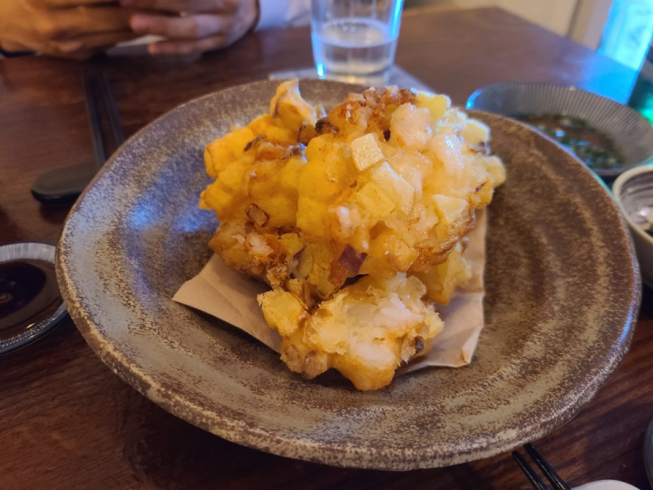 새우 야채튀김은 야채와 새우를 반죽에 섞어 한번에 튀겨낸 음식이었습니다. 감자가 많이 들어있고, 튀김 안에 새우가 숨어있습니다. 아주 특별한 맛은 아니었으나, 튀김이 맛이 없을 수가 없기 때문에 맛있게 먹었습니다.