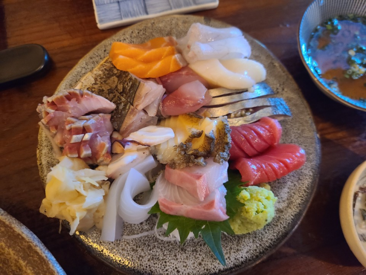 모듬 사시미에는 다양한 종류의 회가 나옵니다. 관자, 연어, 흰살생선, 전복, 한치, 고등어까지 구성이 너무 알차고 좋았습니다. 1.5만 원에 이렇게 다양한 회를 먹을 수 있다는 것이 매우 만족스러웠는데요. 약간 숙성이 되어, 감칠맛이 도는 사시미였습니다.