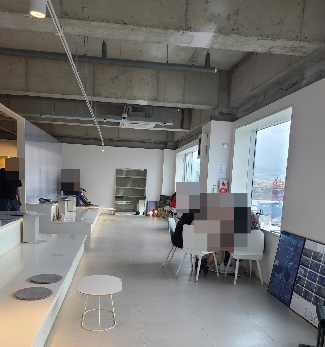 갤러리를 지나면 오션뷰가 펼쳐지는 라운지가 있습니다. 이곳에 자리를 잡고 음료를 마시면 됩니다. 이날은 비가오는 날이라 내부가 조금 추웠습니다. 카페에 담요를 요청하니, 주셨는데 크고 좋았습니다.