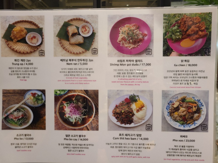 소고기 쌀국수와 돼지고기 덮밥, 볶음 쌀국수, 파파야 샐러드 등 다양한 베트남 음식을 판매합니다. 어떤 음식들은 베트남 음식이라기 보다는 태국 음식에 가깝지 않나 싶습니다.