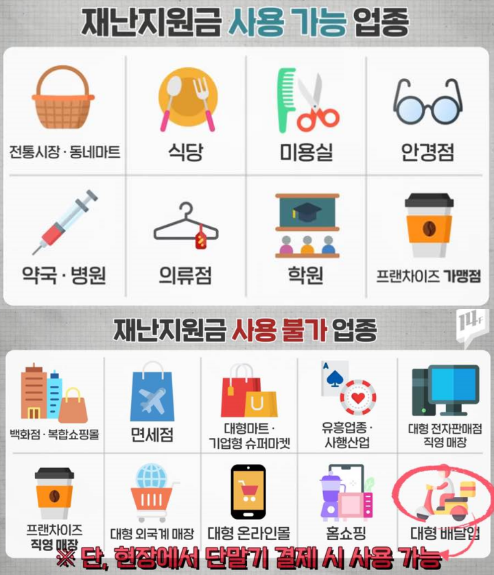 국민지원금의 사용처는 주민등록상 주소지 내 지역사랑 상품권 가맹 점포에서 사용 가능합니다. 서울시에 사시는 분은 서울시 안에서만 사용할 수 있는데요. 도 거주자는 세부 주소에 해당하는 시, 군 내 가맹점에서만 사용이 가능합니다. 국민 지원금 사용 가능 업종과 불가 업종은 다음과 같습니다.